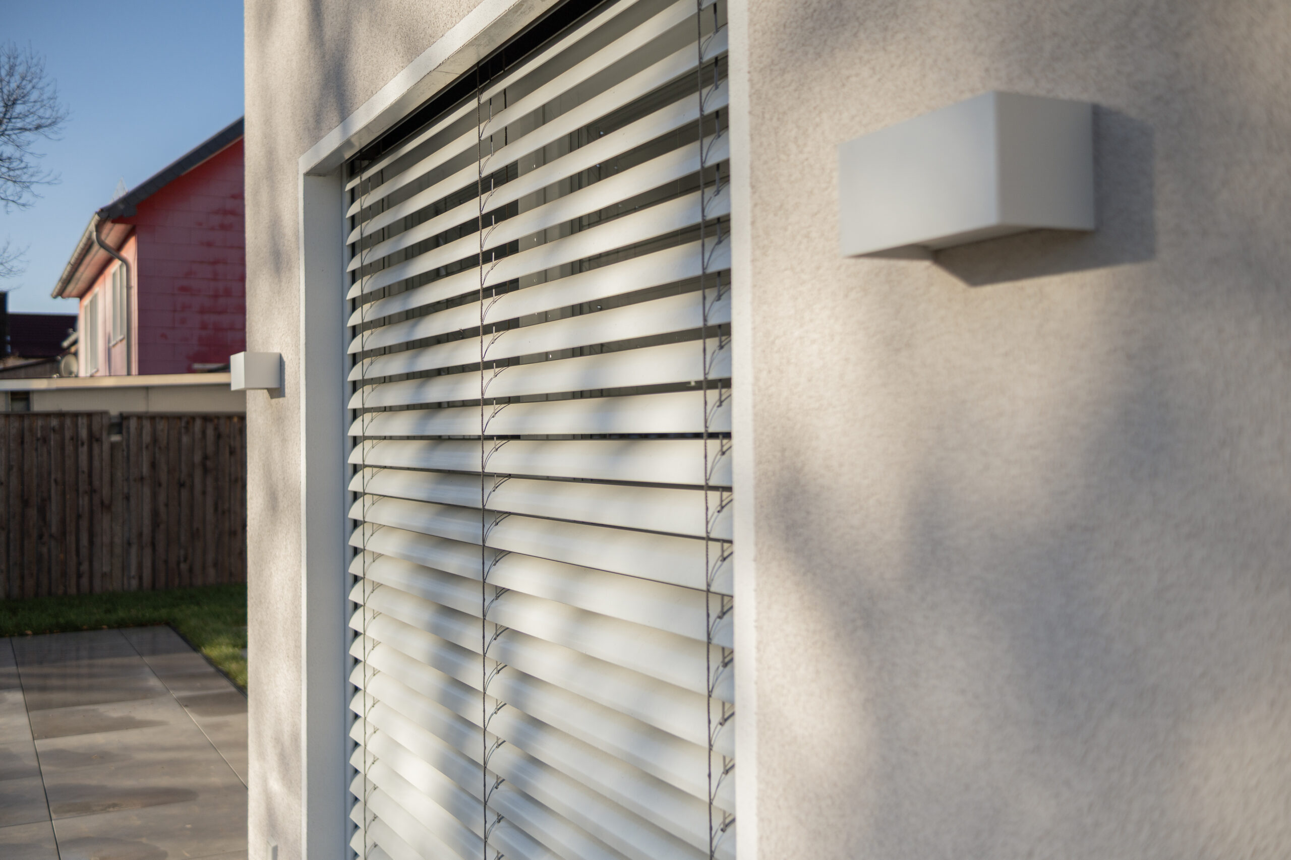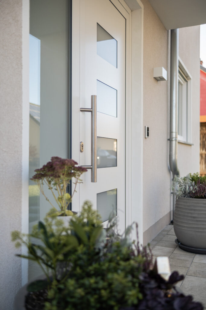 Moderne Aluminiumfenster mit dezenten Rahmenfarben und außenliegenden Raffstores – klare Linien, hoher Komfort. Dazu eine gläserne Haustür.